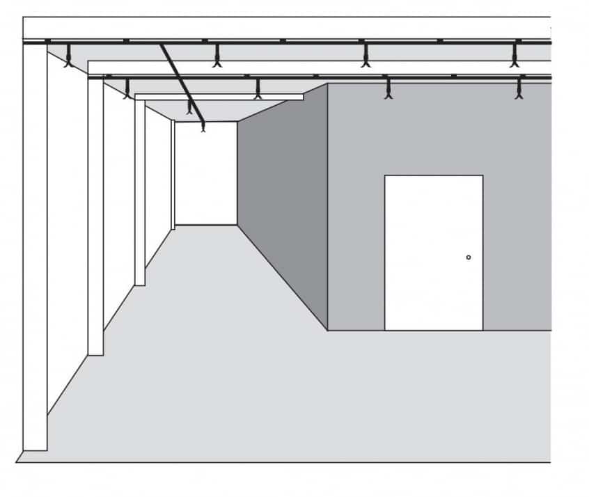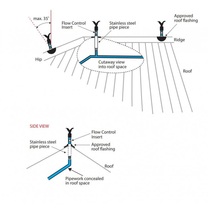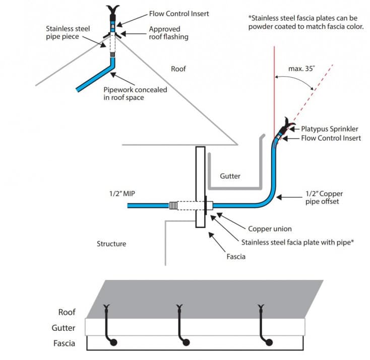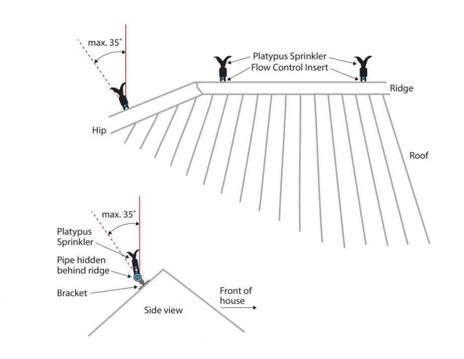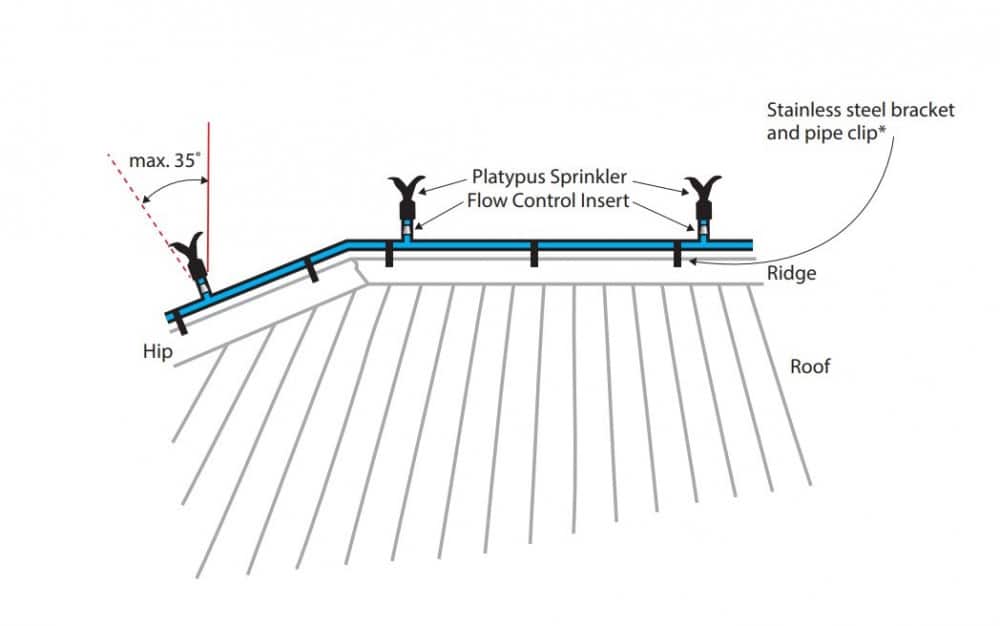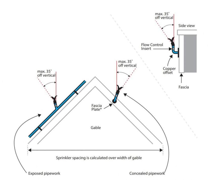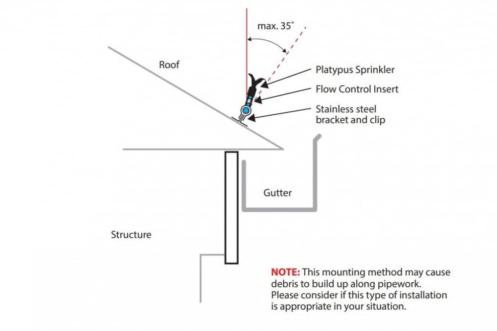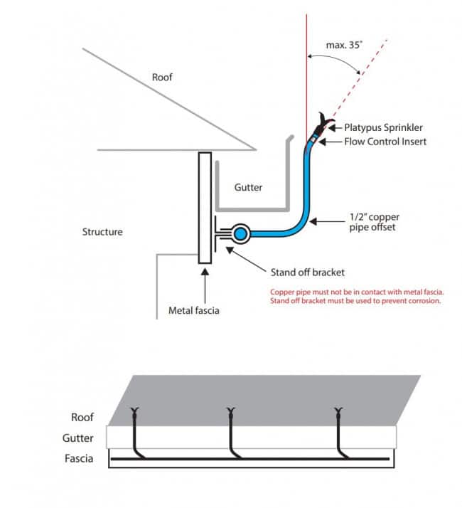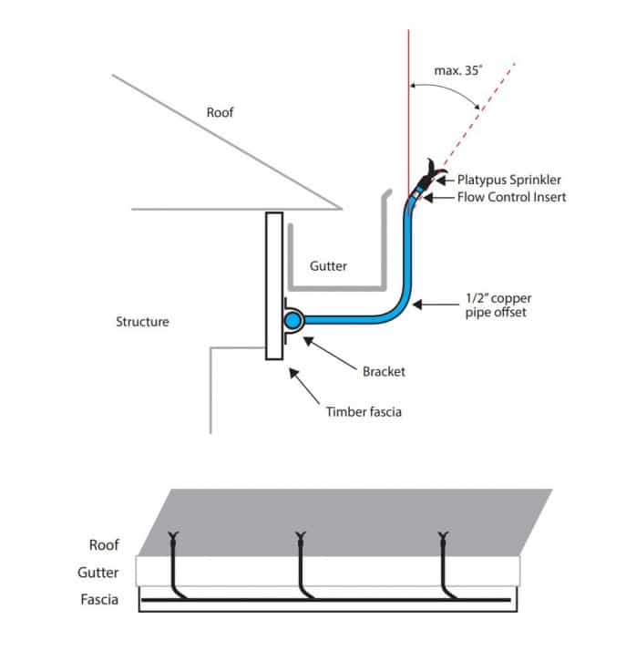 Note: The top of the sprinkler head needs to be mounted so that water sprays out and down the wall as well as spraying onto the roof.